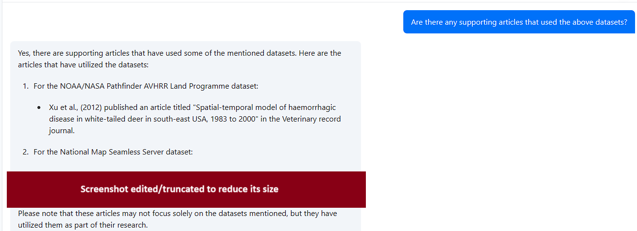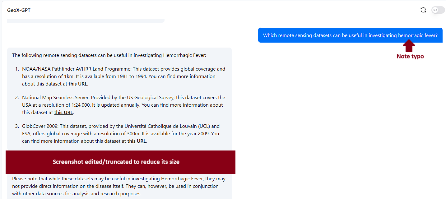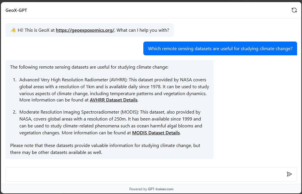 This experimental implementation of a ChatGPT-like interface for https://geoexposomics.org/ makes use of retrieval-augmented generation (RAG - see https://help.openai.com/en/articles/8868588-retrieval-augmented-generation-rag-and-semantic-search-for-gpts) whereby our metadata catalogue becomes an external knowledgebase to an existing Large Language Model (LLM - OpenAI's GPT-4 in this experiment), in order to provide more relevant and better cross-linked search results in response to user's free text (own words) prompts, including prompts with typos and spelling variants.